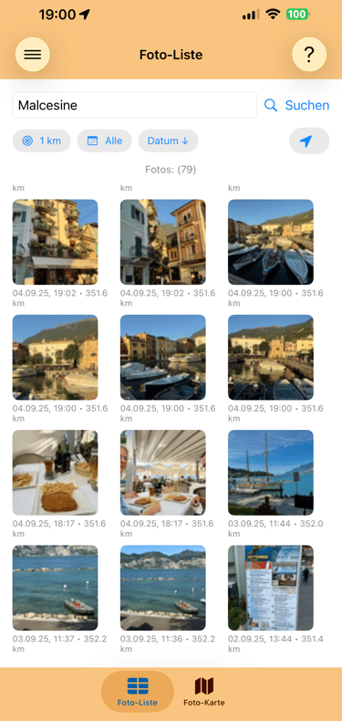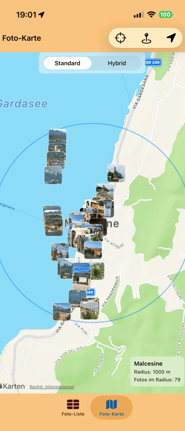 Neue App in Arbeit. HB-PhotoRadar zeigt erstellte Fotos am aktuellen oder beliebigen Standort an, als Liste oder in einer Karte.