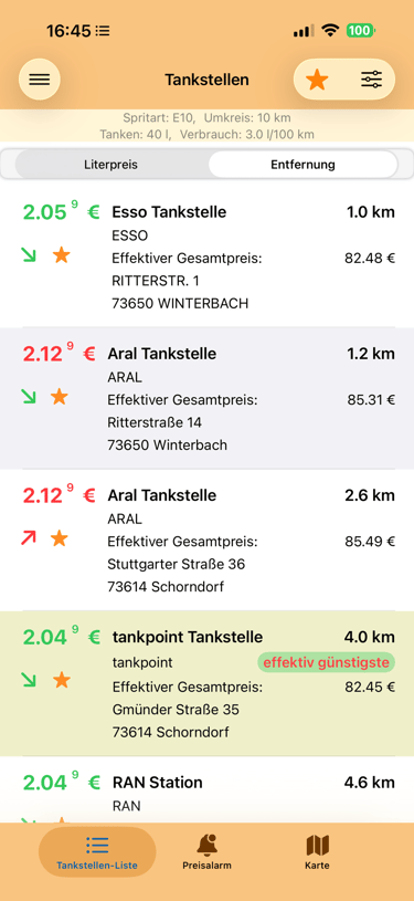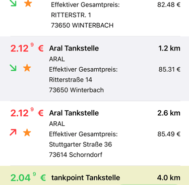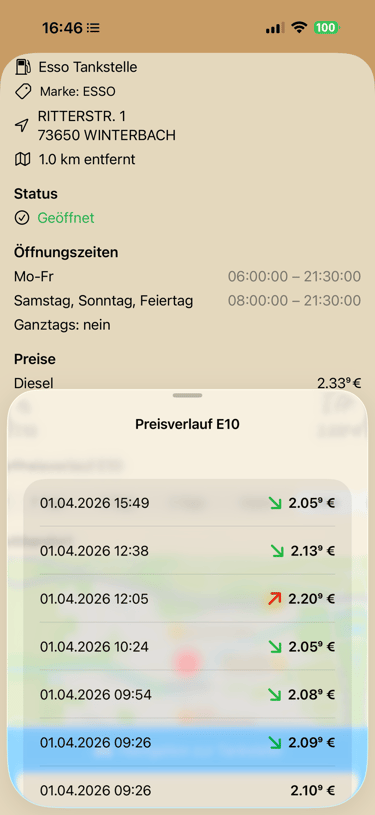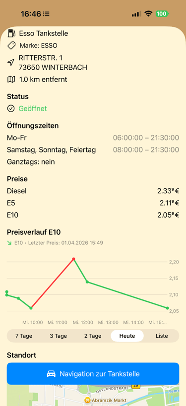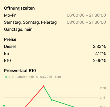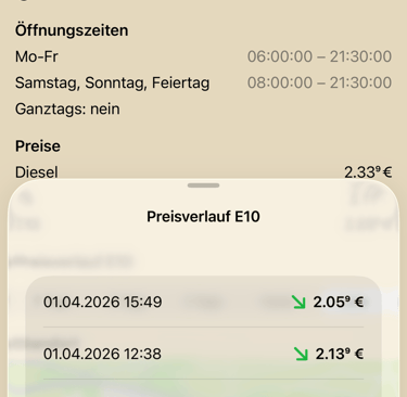 Anzeige des Preisverlaufs der letzten 7 Tage.TankstellenListe:
